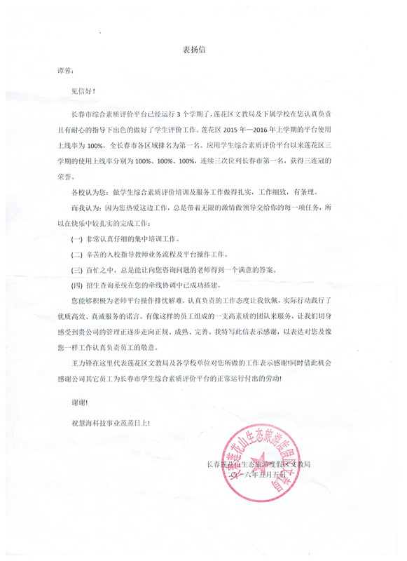 長春蓮花山生態(tài)旅游度假區(qū)文教局在給譚蓉的感謝信中表示,在使用學(xué)生綜合素質(zhì)評價(jià)平臺3個(gè)學(xué)期以來,蓮花區(qū)文教局及下屬學(xué)校在其指導(dǎo)下出色的做好了學(xué)生評價(jià)工作,蓮花區(qū)2015年—2016年上學(xué)期的綜合素質(zhì)評價(jià)平臺使用上線率100%,全長春市各區(qū)域排名第一。應(yīng)用學(xué)生綜合素質(zhì)評價(jià)平臺以來,蓮花區(qū)在使用上線率上連續(xù)三次位列長春市第一名,獲得三連冠的榮譽(yù)。
