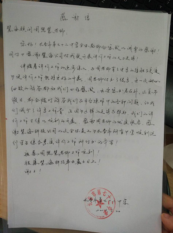 長春市第七十二中學(xué)感謝慧??萍既w員工為長春所有中學(xué)順利運(yùn)行學(xué)生綜合素質(zhì)評價(jià)工作所付出的辛苦。